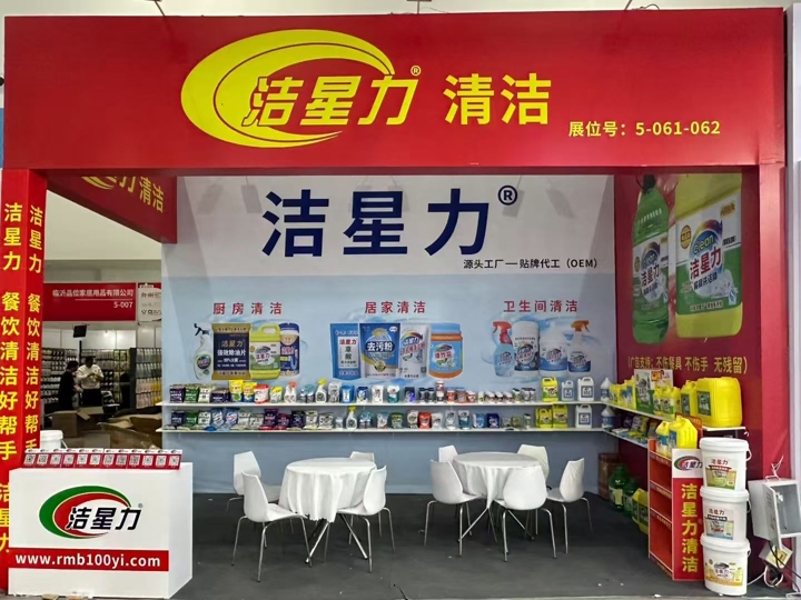 本次潔星力參展產品有王牌餐飲清潔產品——潔星力除垢劑、密胺餐具清潔粉、去污粉等,廚房油污清潔產品——除油片、油污凈、洗潔精,衛生間清潔產品——衛生間清潔液、草酸潔瓷粉、衛生間清潔粉等。同時還有潔星力新推出的洗碗機專用洗滌劑和催干劑。