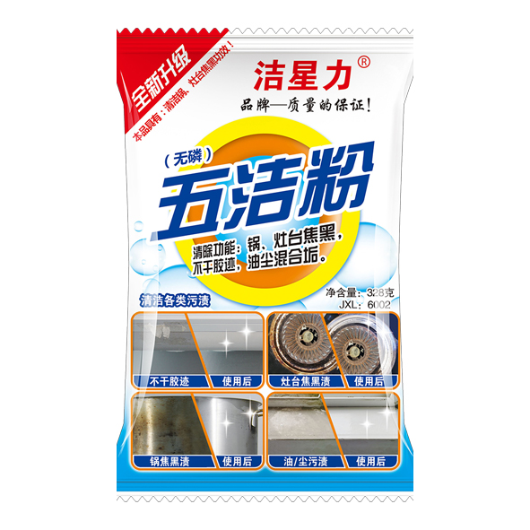 拿整袋潔星力五潔粉躺著來回晃動10下打開袋口,取一半倒入碗中,加上清水調配成膏狀,涂抹在污漬上,用清潔抹布或徒手擦拭即可,然后用清水沖洗干凈。